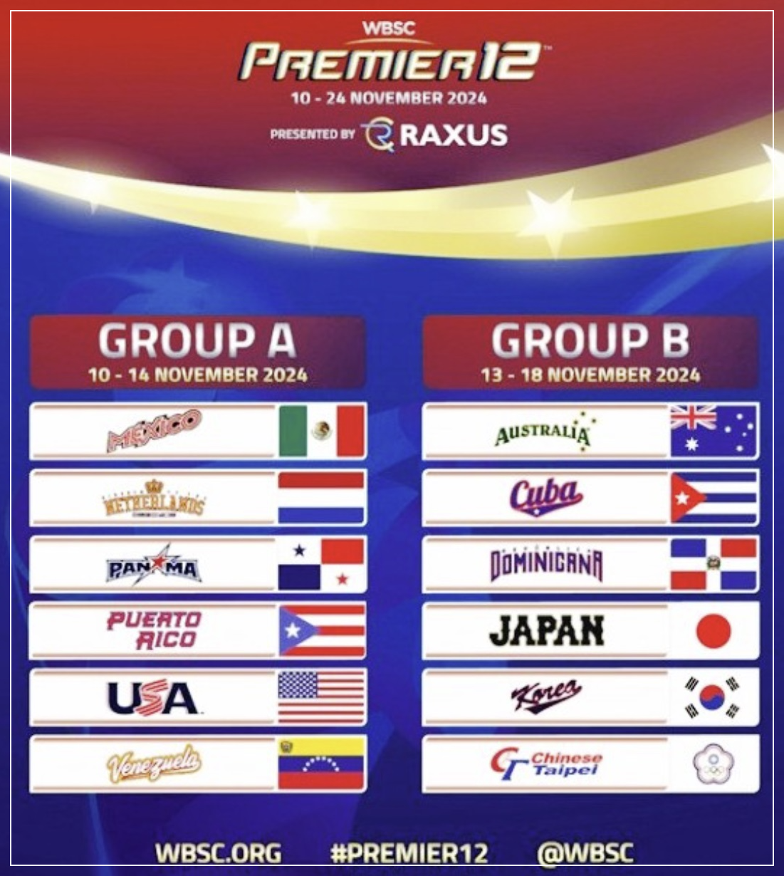 WBSC 프리미어12 대회는 세계 야구 소프트볼 연맹(WBSC)이 주관하는 국제 야구 대회로, 2015년 첫 대회를 시작으로 세계 상위 12개 국가가 참가하는 토너먼트입니다. 프리미어12는 WBSC의 야구 국가 랭킹 상위 12팀이 출전하여 대륙별로 최상위 실력을 겨루는 경기로 자리잡았습니다. 이 대회는 야구의 국제적 위상을 높이고, 특히 비주류 야구 국가에서의 인기를 확산하는 데에 중요한 역할을 하고 있습니다. 프리미어12의 시작과 목적프리미어12는 야구가 올림픽 정식 종목에서 제외된 이후, 올림픽 수준의 국제 야구 대회를 제공하고자 하는 의도로 창설되었습니다. 2015년 일본과 대만에서 첫 대회가 개최되었으며, 이 대회는 WBSC가 주최한 최대 규모의 야구 행사 중 하나로 자리잡았습니다. 이후 프리미어..