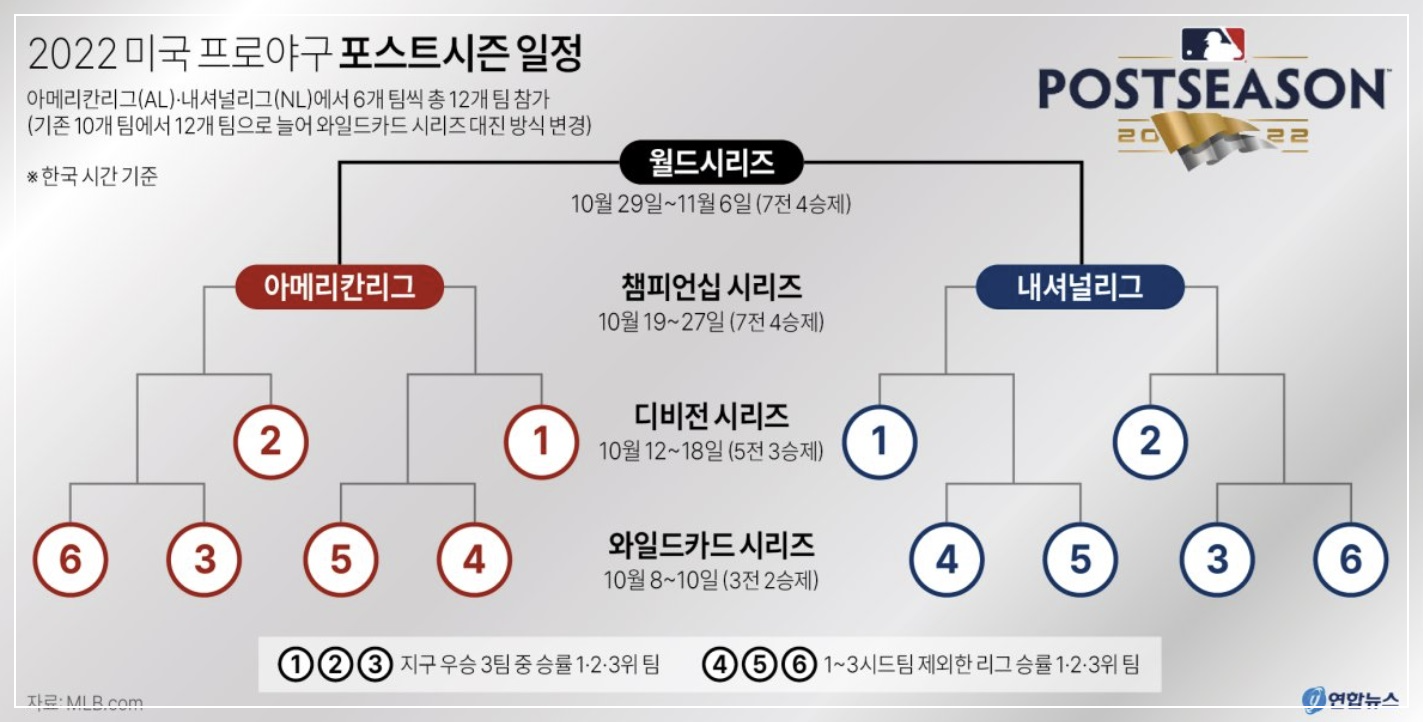 미국 메이저리그(MLB)의 포스트시즌은 매년 162경기의 긴 정규 시즌을 마친 후, 각 리그의 상위 팀들이 우승을 놓고 격돌하는 토너먼트 형식의 경기입니다. 이 대회는 팀들이 한 시즌 동안 쌓은 노력과 성과를 바탕으로 그들의 진정한 우승 자격을 증명하는 무대이자, 세계적으로 가장 주목받는 야구 이벤트 중 하나입니다. 포스트시즌은 와일드카드 시리즈, 디비전 시리즈(DS), 리그 챔피언십 시리즈(LCS), 그리고 최종적으로 월드 시리즈(WS)로 구성되어 있습니다. 1. 포스트시즌의 역사적 배경MLB 포스트시즌의 형식은 시간이 흐르면서 몇 차례 변화해 왔습니다. 초창기에는 내셔널 리그와 아메리칸 리그의 정규 시즌 우승 팀이 바로 월드 시리즈에 진출해 맞붙는 방식이었습니다. 하지만 1969년, 리그의 확장과 ..