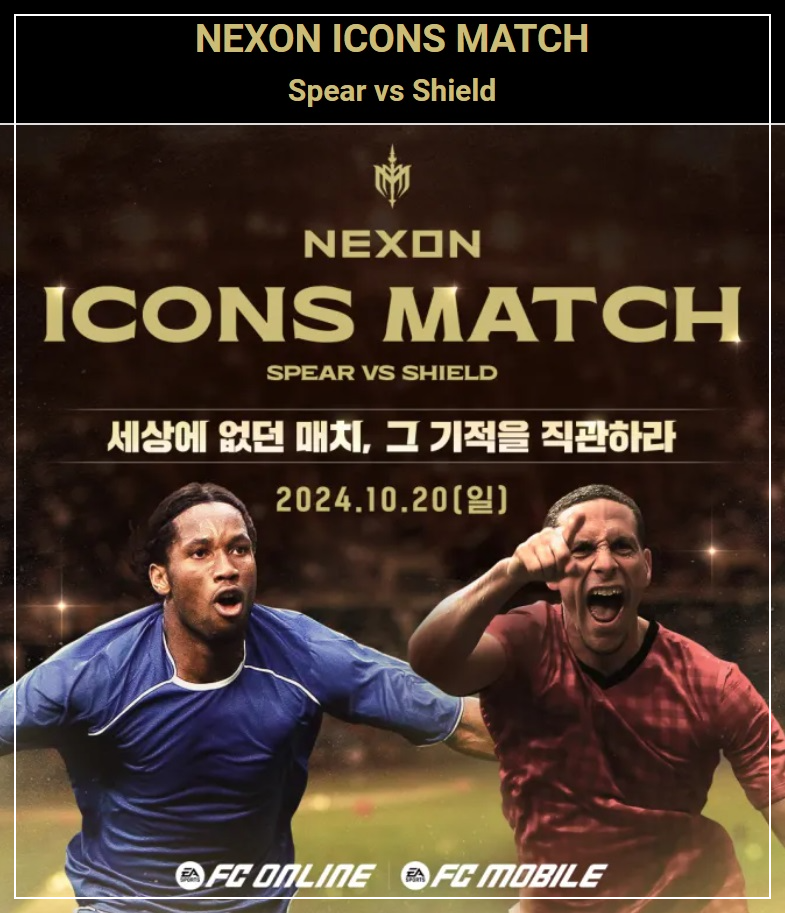 세상에 없던 매치, 그 기적을 직관하라!2024 NEXON ICONS MATCH 일정2024년 10월 20일(일) 오후 6:00 장소서울월드컵경기장 주최 및 주관넥슨 / 슛 포 러브 중계네이버 스포츠, MBC, SOOP, FC 온라인 공식 유튜브 19일 이벤트 매치 중계 ▶ ▶ ▶ 네이버 스포츠 ▶ ▶ ▶ 20일 아이콘 매치 경기 중계 ▶ ▶ ▶ MBC ▶ ▶ ▶ 경기일정구분일정장소2024 NEXON ICONS MATCHDAY1 EVENT MATCH10/19(토)서울 월드컵경기장DAY2 MAIN MATCH10/20(일) 참가선수 명단 FC SpearShield UTD감독티에리 앙리파비오 칸나바로코치박지성이영표선수디디에 드록바, 디미타르 베르바토프, 카카, 루이스 피..