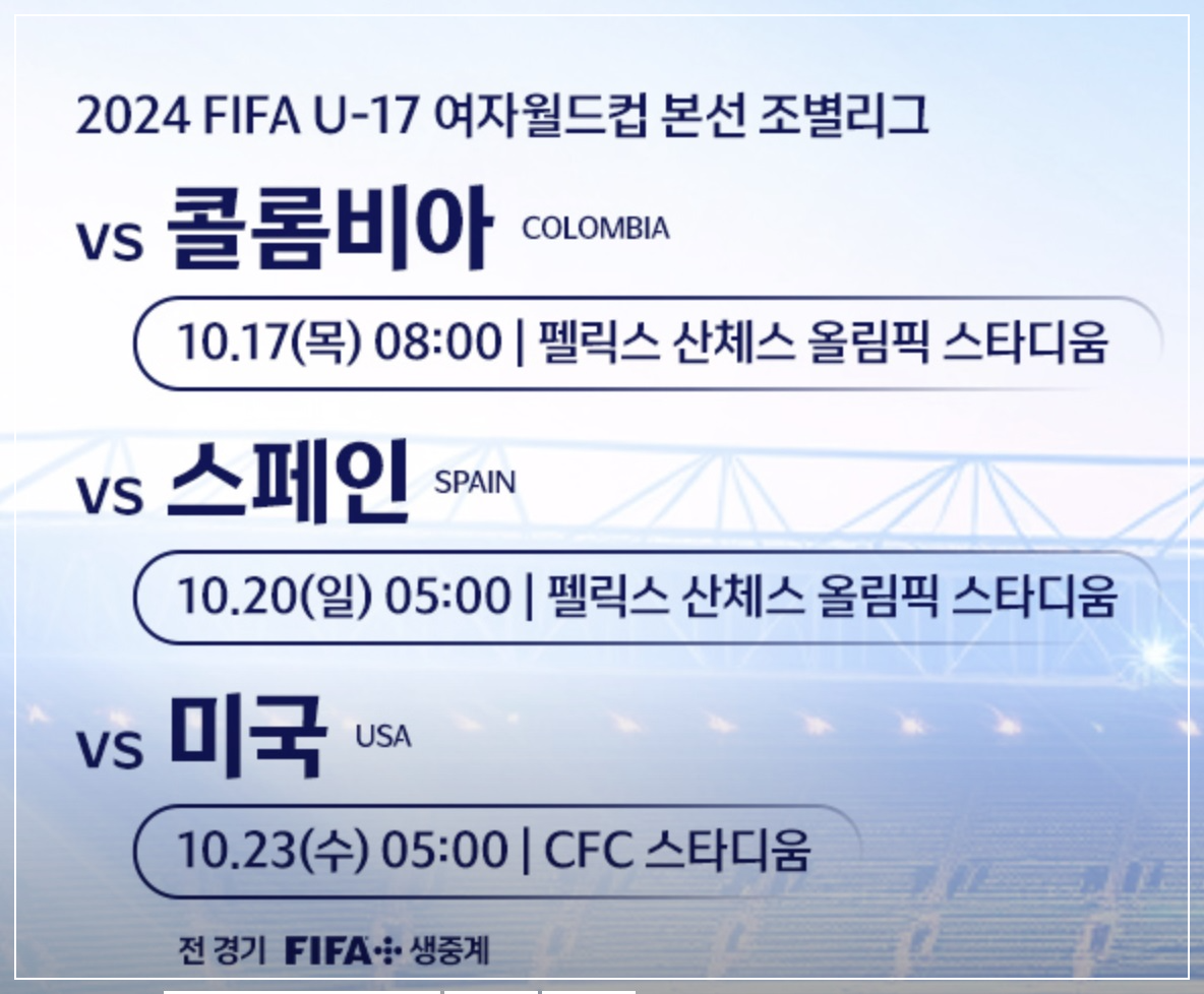2024 FIFA U-17 여자 월드컵 본선에서 대한민국은 스페인, 미국, 콜롬비아와 함께 B조에 속해 치열한 조별리그를 펼칩니다. 특히 첫 경기인 콜롬비아와의 경기는 중요한 분수령이 될 것입니다.