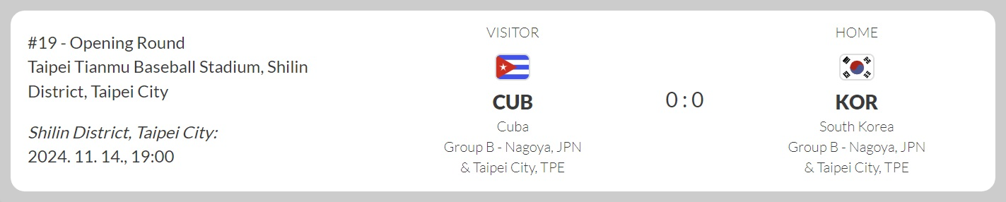 쿠바는 11월 14일 한국과 2024 WBSC 프리미어12에서 맞붙는 만큼 양 팀 모두에게 강력한 시험대가 될 것으로 예상됩니다. 2015년 프리미어12 초대 우승과 2019년 준우승을 차지하는 등 이번 대회에서 뛰어난 활약을 펼친 한국은 여전히 강력한 상대입니다. 김도영과 정해영 등 KBO에서 성공적인 시즌을 보낸 주목할 만한 선수들이 라인업에 포함되어 있습니다. 또한 KBO 시즌 내내 일관된 모습을 보여준 투수 원태인을 자랑하며 팀 로테이션에 결정적인 역할을 하고 있습니다.
